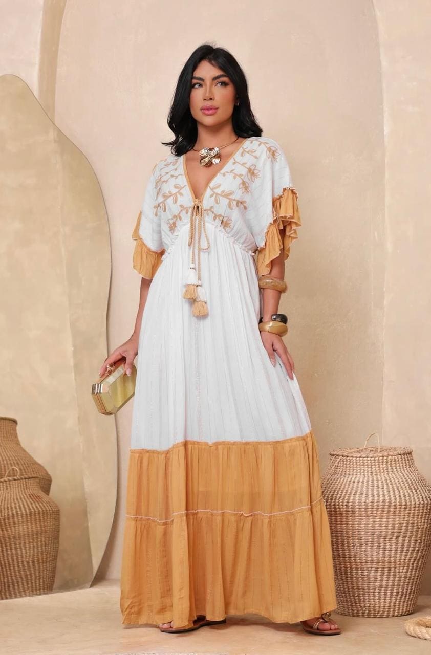 Vestido Carmela dourado/branco cod. 10141